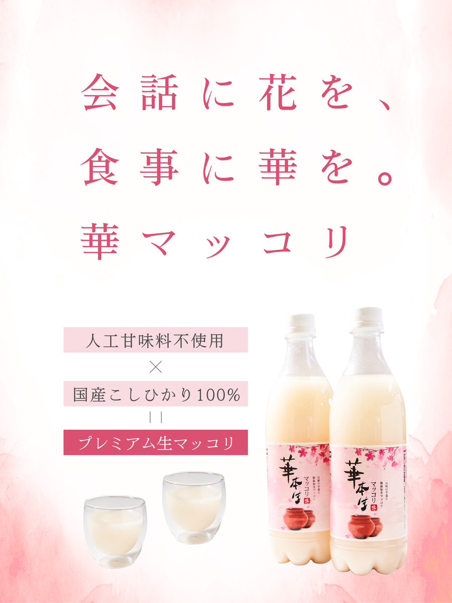 華マッコリは、千葉県芝山町に位置する酒蔵で作られているプレミアム生マッコリです。日本産こしひかり米を100%使用しており、その特徴は伝統的な韓国技法により作られた「呼吸するカメ」の中で熟成されたことにあります。人工甘味料は一切使用されておらず、お米由来の自然な甘みと華やかな香りが存分に楽しめます。